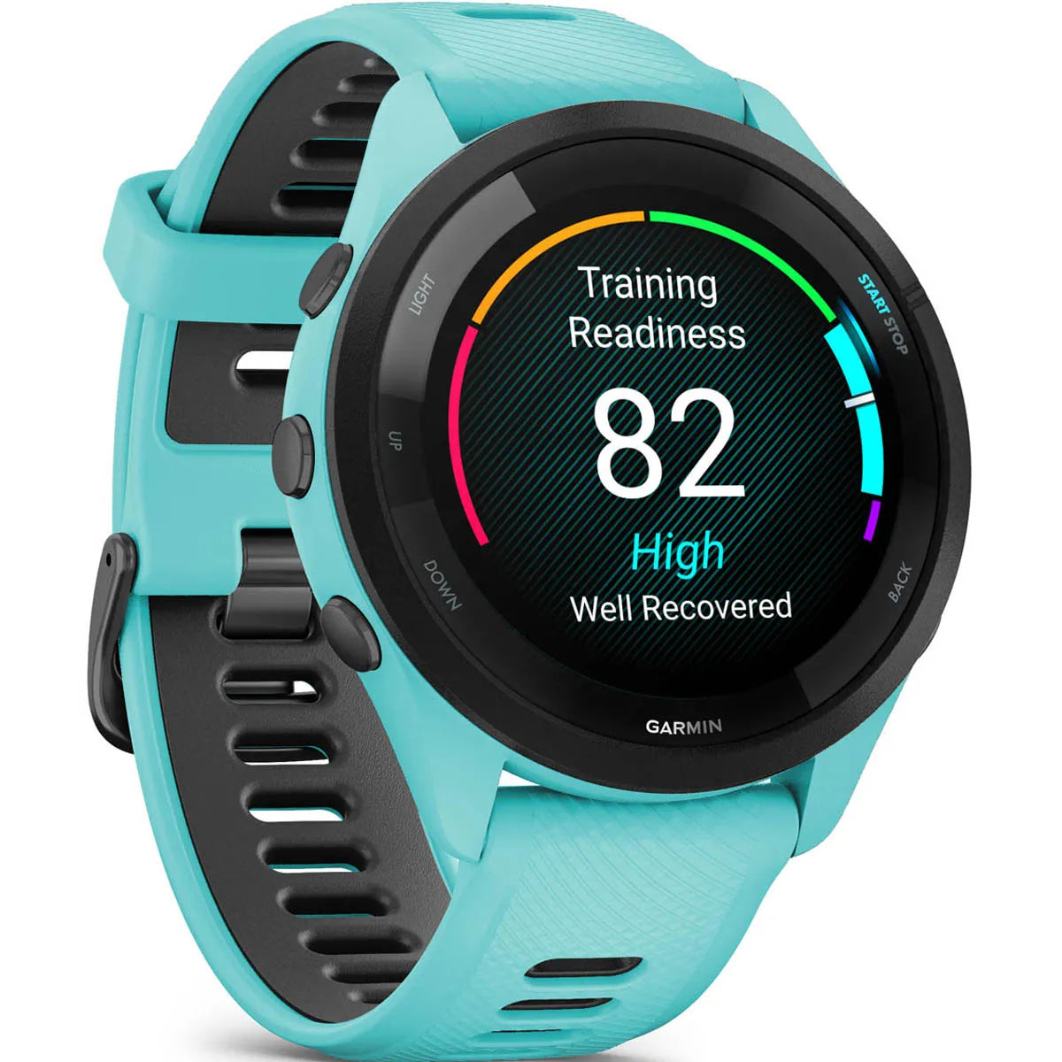 GARMIN Forerunner 265 – Smartwatch - Black Bezel with Aqua Case and Aqua/Black Silicone Band