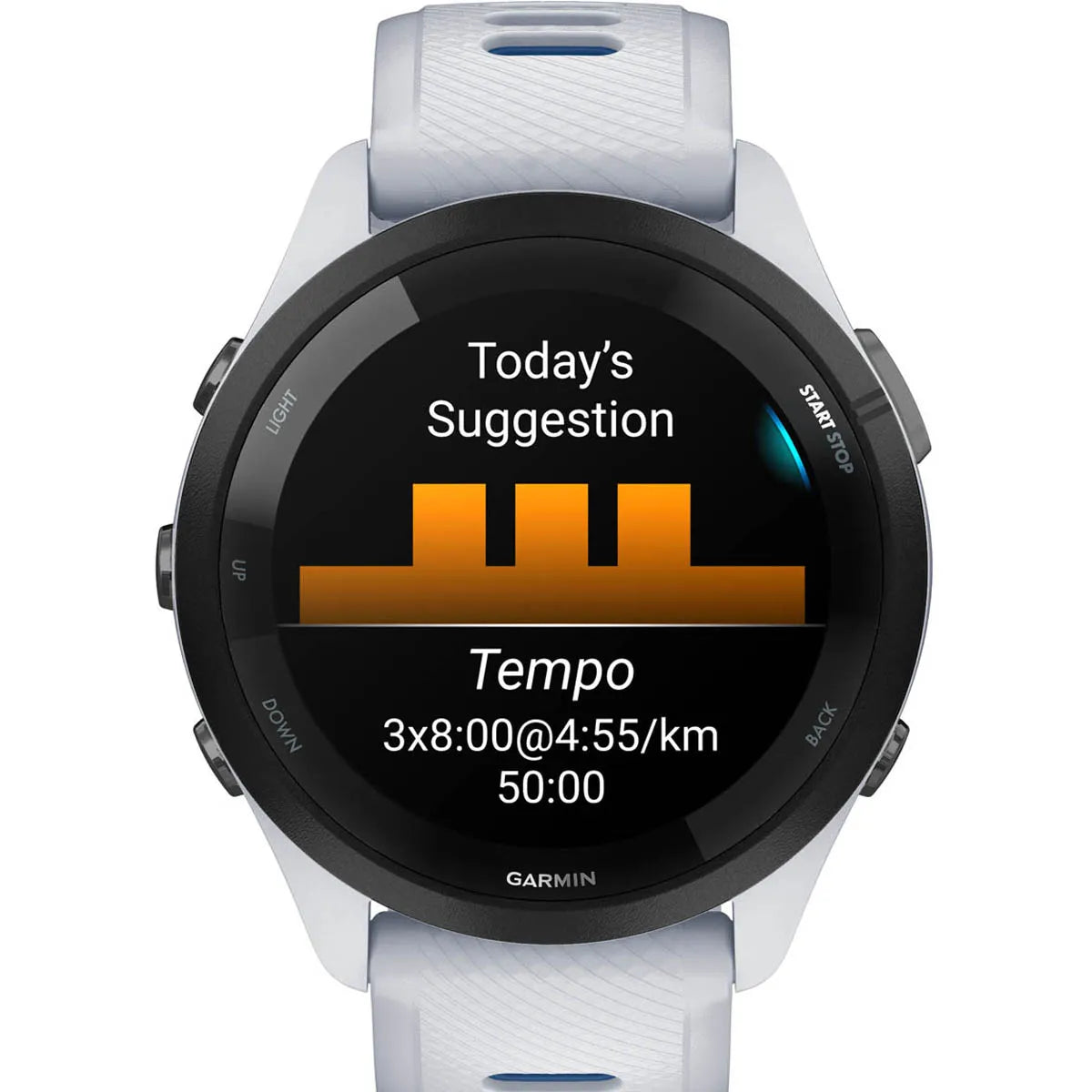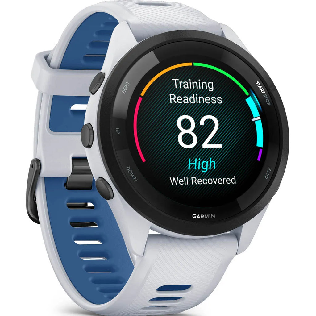 GARMIN Forerunner 265 – Smartwatch - Black Bezel with Whitestone Case and Whitestone/Tidal Blue Silicone Band